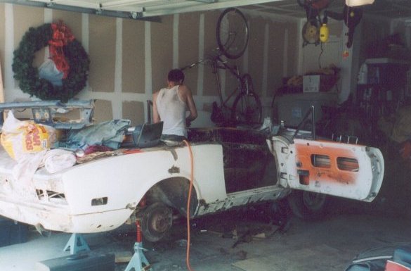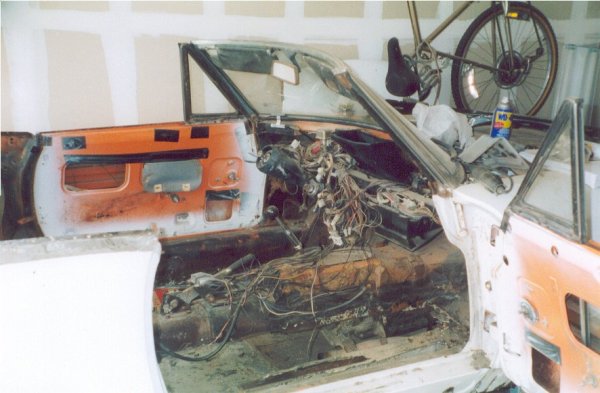 This is Justin's car. After helping me work on mine, he got the Fiat yen, and eventually saw this one on Ebay, sitting in a field in Oklahoma. He won the auction, luckily not paying too much for it, and we drove up one Saturday and towed it back. As soon as we got it in the garage, one of the trailing arms dropped off. We found that the entire floor - and I mean entire - had rusted out. But there was little or no rust anywhere else. The convertible top had been fairly new when the car was parked, but over the years (five or six) the rear window dropped out and let about two inches of water sit in the bottom of the car, which mostly disintegrated.