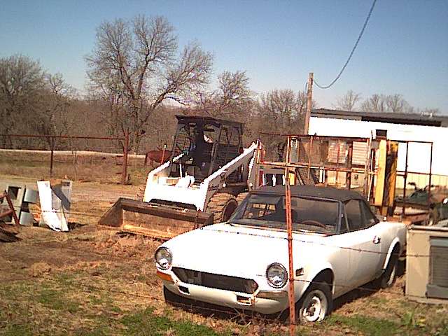 This is Justin's car. After helping me work on mine, he got the Fiat yen, and eventually saw this one on Ebay, sitting in a field in Oklahoma. He won the auction, luckily not paying too much for it, and we drove up one Saturday and towed it back. As soon as we got it in the garage, one of the trailing arms dropped off. We found that the entire floor - and I mean entire - had rusted out. But there was little or no rust anywhere else. The convertible top had been fairly new when the car was parked, but over the years (five or six) the rear window dropped out and let about two inches of water sit in the bottom of the car, which mostly disintegrated.